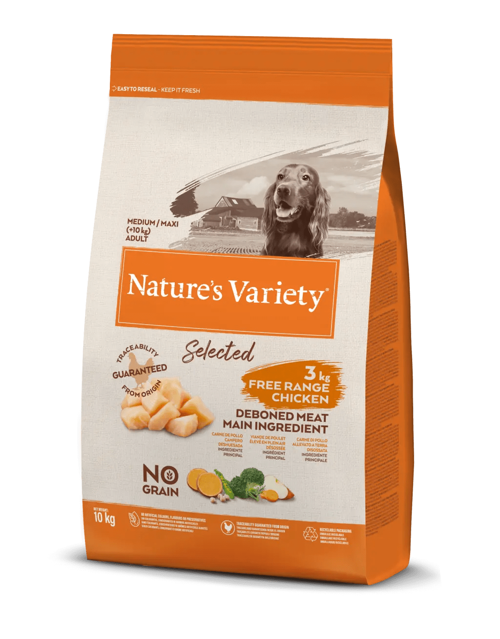 Carne de pollo campero deshuesada* (30%), proteína deshidratada de pollo (22%), guisantes deshidratados* (12%), garbanzos deshidratados* (5,5%), almidón de guisante*, grasa avícola* (5%), boniato deshidratado* (4%), hidrolizado de proteína (3,5%), fécula de patata*, fibra de guisante*, raíz de achicoria deshidratada*, sustancias minerales, zanahoria deshidratada* (0,5%, equivalente a un 4% de zanahoria fresca), brócoli deshidratado* (0,5%, equivalente a un 4% de brócoli fresco), manzana deshidratada* (0,3%, equivalente a un 2% de manzana fresca), alga marina deshidratada* (0,01%), romero deshidratado* (0,01%)., *Ingredientes naturales.