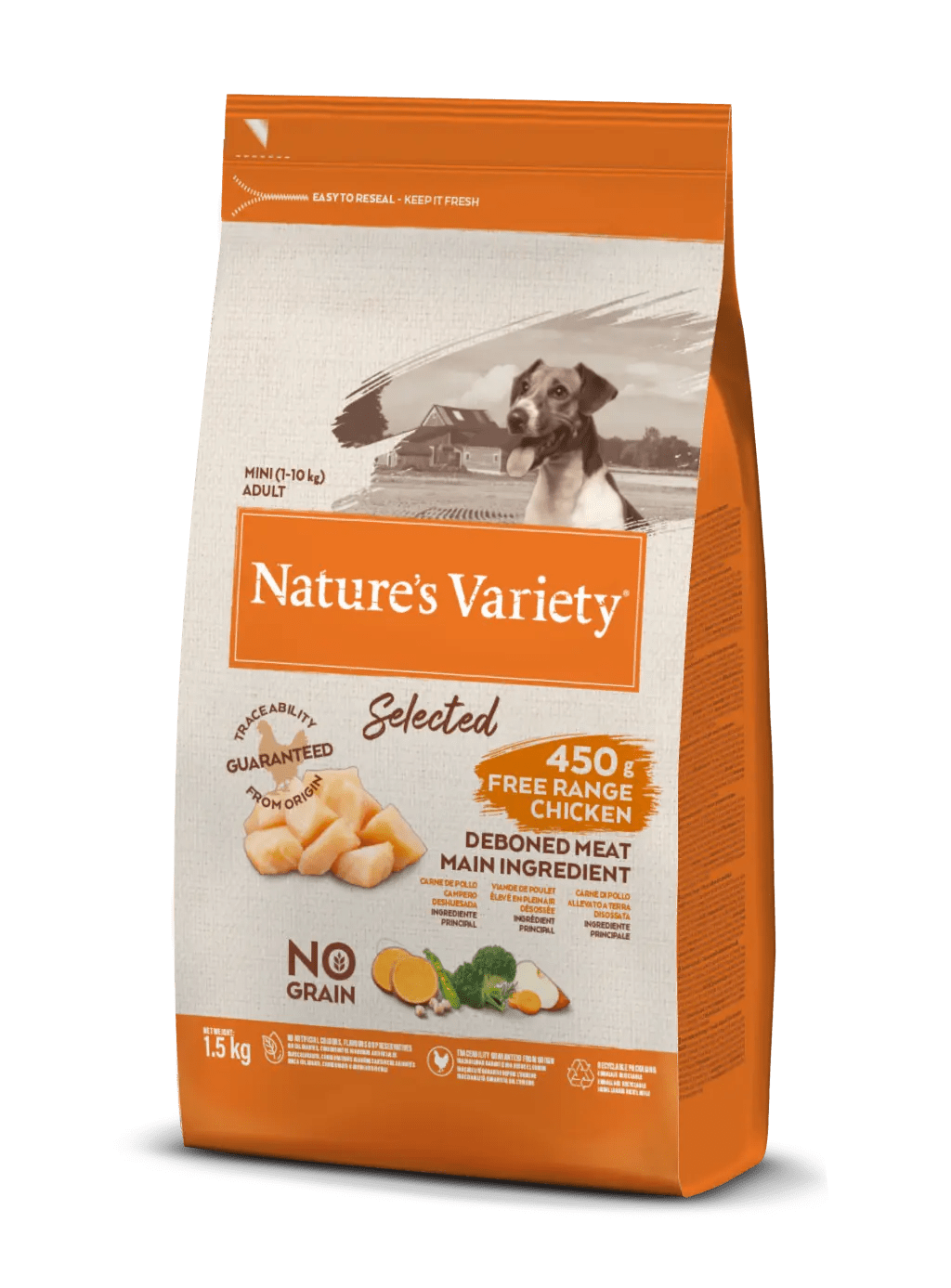 Carne de pollo campero deshuesada* (30%), proteína deshidratada de pollo (23%), guisantes deshidratados* (12%), boniato deshidratado* (7%), grasa avícola* (6%), garbanzos deshidratados* (5,5%), almidón de guisante*, hidrolizado de proteína (3,5%), raíz de achicoria deshidratada*, fibra de guisante*, sustancias minerales, zanahoria deshidratada* (0,5%, equivalente a un 4% de zanahoria fresca), brócoli deshidratado* (0,5%, equivalente a un 4% de brócoli fresco), manzana deshidratada* (0,3%, equivalente a un 2% de manzana fresca), alga marina deshidratada* (0,01%), romero deshidratado* (0,01%), *Ingredientes naturales.