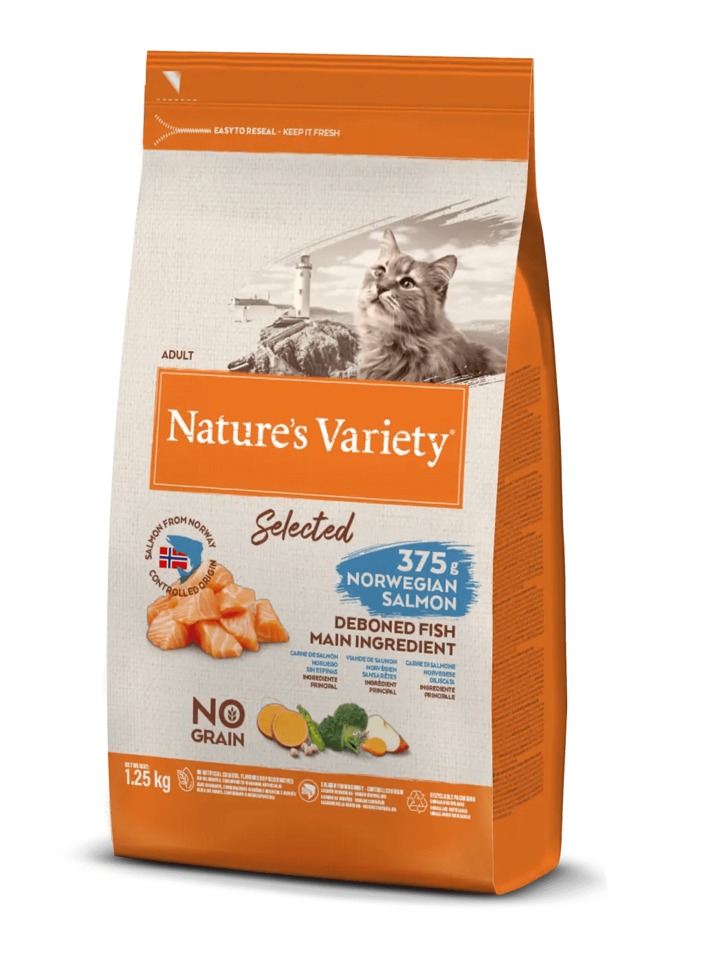 Carne de salmón noruego sin espinas* (30%), proteína deshidratada de atún (13%), proteína de patata, almidón de guisante*, boniato deshidratado* (4%), hidrolizado de proteína (3%), zanahoria deshidratada* (0,5%, equivalente a un 4% de zanahoria fresca), brócoli deshidratado* (0,5%, equivalente a un 4% de brócoli fresco), manzana deshidratada* (0,3%, equivalente a un 2% de manzana fresca), alga marina deshidratada* (0,01%), romero deshidratado* (0,01%)., *Ingredientes naturales.